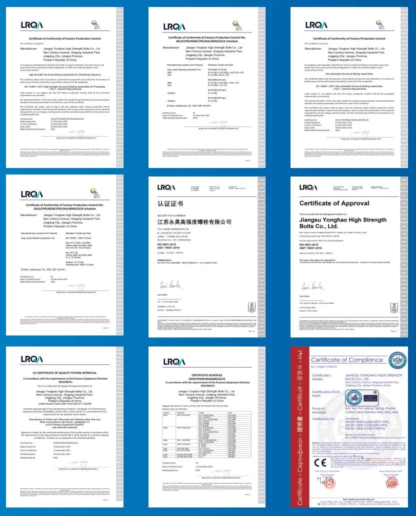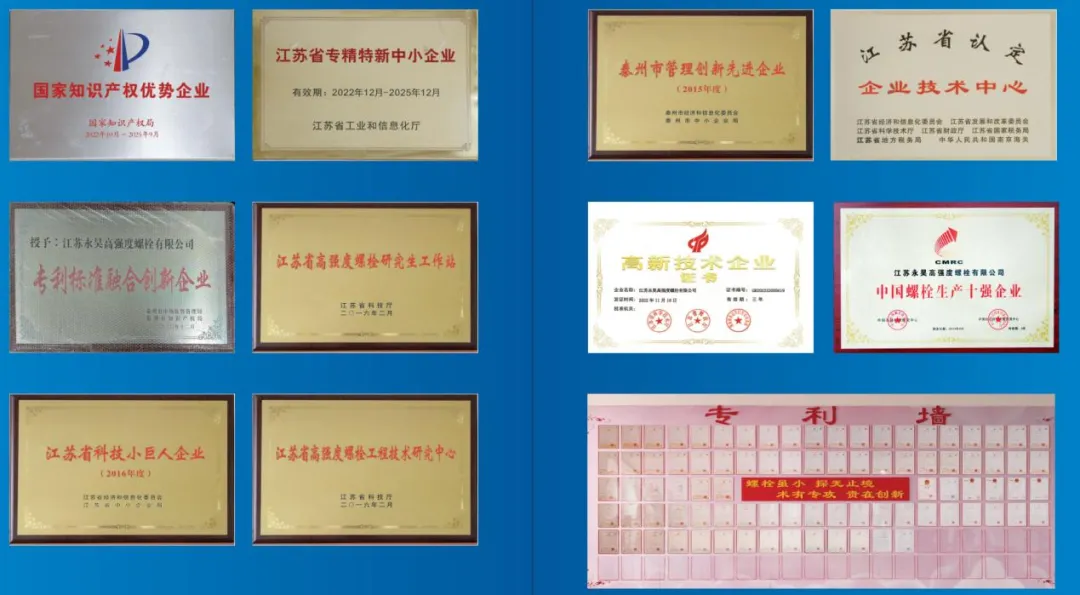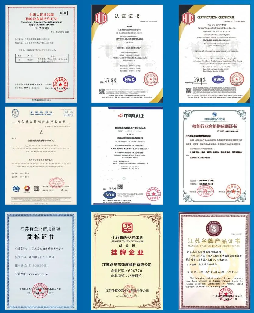 江苏永昊高强度螺栓有限公司位于长江三角洲经济开发区,地处江阴长江大桥北岸,靖江市东首,省级经济开发区内,与上海、无锡、苏州、南通相依,高速公路、高速铁路穿城而过,水陆交通便捷,环境优雅,宜居、宜业,经济繁荣。公司创建于1990年4月,占地面积96000平米,建筑面积85000平米。公司拥有高素质员工520人,高级工程师58人,职工平均技术水平达6级,有各种现代化生产、检测设备586台(套)。公司与多所高校(浙大、上海东华、苏州大学、江苏科技大学、昆明理工、浙江科研等)联合成立研发中心,拥有江苏省认定企业技术中心、江苏省高强度螺栓研究生工作站、江苏省高强度螺栓工程技术研究中心、江苏省专精特新中小企业、江苏省科技小巨人企业;多种产品被认定为江苏省高新技术产品,“永太”牌螺栓被江苏省认定为名牌产品;公司致力于紧固件的研发与制造,拥有较强的自主创新能力,到2023年公司拥有国家知识产权局授权的发明专利65项,是国家知识产权优势企业、高新技术企业、中国螺栓生产十强企业、泰州市管理创新企业。公司主要生产M4—M125高强度螺栓、螺母以及各种异型耐低温、抗冲击螺栓,产品广泛应用于电梯、桥梁、军工、风电、核电、特高压行业,成功配套奥的斯电梯、西子航空研究院、许继—西门子、上海重型机械、中国一重、三一重工、中国航天、秦山核电、中广核、天顺风能、大连重工、大连造船、上海造船、中国南车、东方管道、南高齿、中信博、中国电建、中国能建、中联重科、中天科技等数百家国家重点企业,电力金具螺栓是国家电科院认定产品;此外,产品还出口巴西、西班牙、印度、乌克兰、越南、孟加拉、香港等国家和地区。