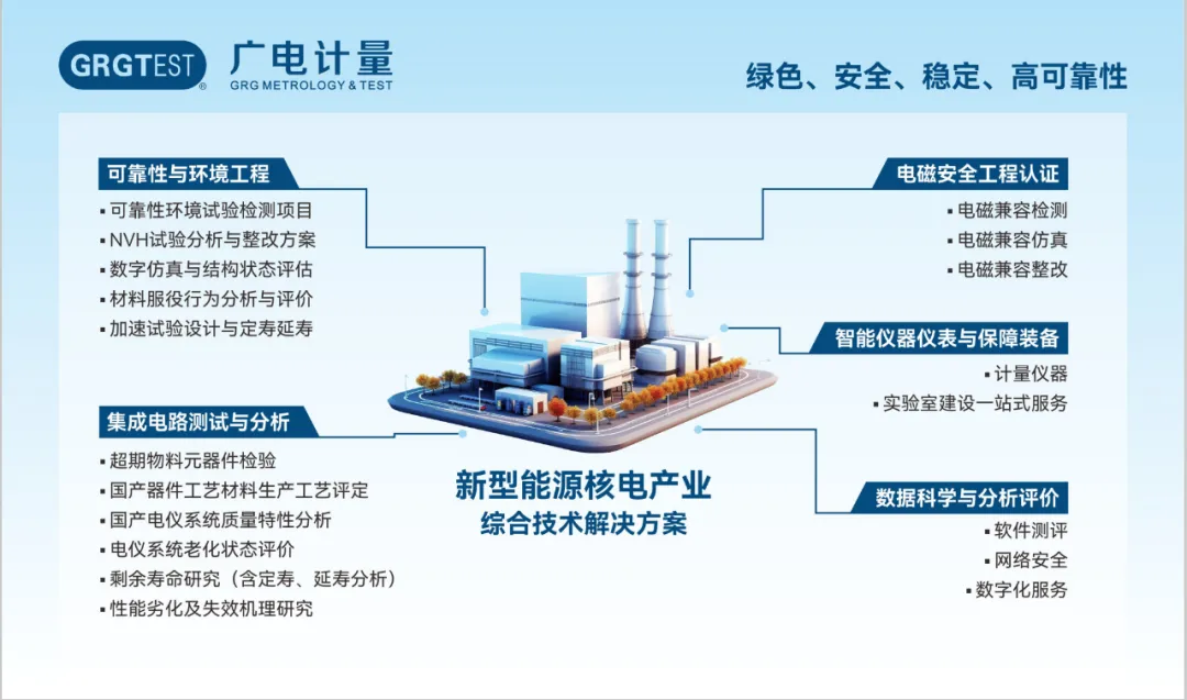 广电计量是广州数字科技集团旗下高科技上市企业,创立于2002年,是国内领先的国有第三方计量检测上市企业,面向特殊装备、航空及低空经济、智能网联汽车、数字经济、新能源及核电等国家战略性产业领域,构建了“计量检测+科研服务+评价咨询+规划设计+认证”一站式综合技术服务能力,其中计量校准、可靠性与环境工程、电磁兼容检测业务的经营规模和服务能力居行业前列。在核电领域,广电计量围绕国家能源战略,聚焦核电产业上下游需求,构建了设备原材料、元器件及零部件的环境应力筛选、可靠性试验与寿命评估、电磁兼容、仿真分析等综合技术服务能力,在核岛、常规岛的关键设备上的检测业务持续突破,助力核电产业绿色、安全、高质量发展。