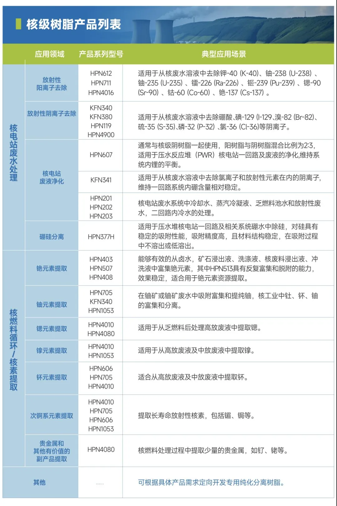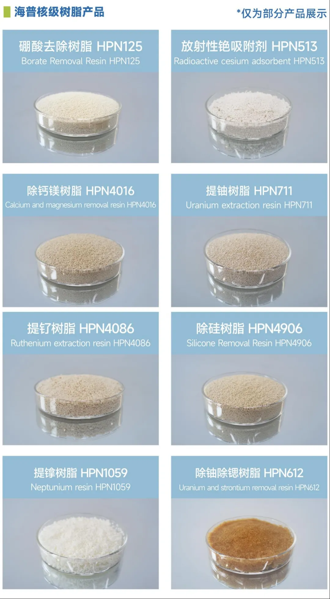 核工业在发展过程中会产生大量的放射性废液,这些废液的安全处理对于保障核能的绿色和可持续发展至关重要。为了有效净化反应堆冷却剂、乏燃料池冷却水、蒸汽发生器排污水以及放射性废水排放等系统,选用的核级树脂应具备交换容量大、出水标准高和稳定性好等特点,以减少放射性废物的产生。针对核废液的无害化处置,海普成功开发出高容量、高稳定性的特种吸附材料,适用于各类低、中、高放射性废液无害化处置,服务于核工业安全绿色发展。