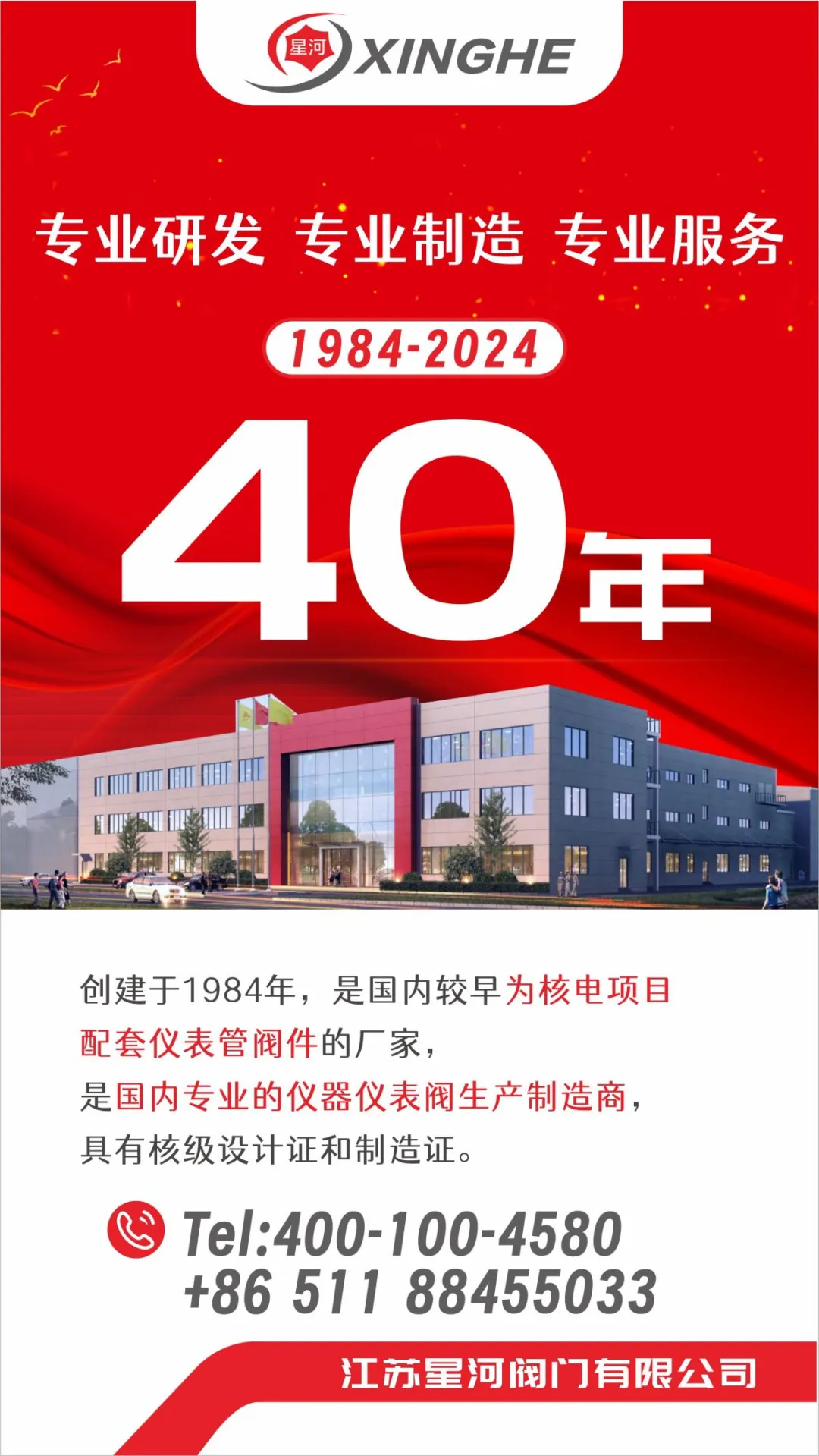 江苏星河阀门有限公司创建于1984年,是国内最早为核电项目配套仪表管阀件的厂家。公司于1999年即首次取得了民用核承压设备制造许可证,并延续至今公司成立三十年来,一真专注并深耕于仪表管阀件行业,通过不断的技术创新,可靠的产品质量以及持续满足顾客要求的能力,使得产品在核电、石油、化工、天然气、机车、氢能源、半导体等行业中得到广泛应用,赢得了优质的市场口碑。