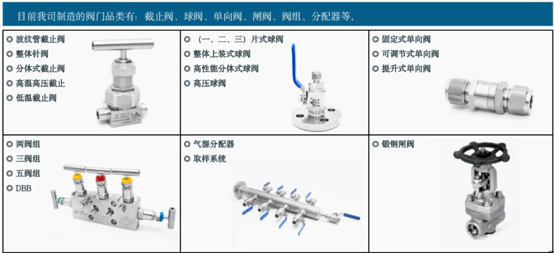 公司紧贴市场发展,用心倾听用户的需求,以满足市场需求作为创新导向同时,我司在核电、氢能、石化等领域,不断与设计院、科研院校、业主进行深层次共同联合研发,推动仪表管阀件国产化,着力解决国家重大建议项目因贸易战,推迟项目周期的问题。我们的四大系列产品:阀门及阀组、管件、防爆电气及接地件、桥架制造(1)仪表阀门是仪控测量系统中重要的控制部件,具有截止、调节、导流、防止逆流、稳压、分流等功能。仪表阀门质量的稳定对整个仪控系统测量数据的准确性及安全性有着至关重要的作用。