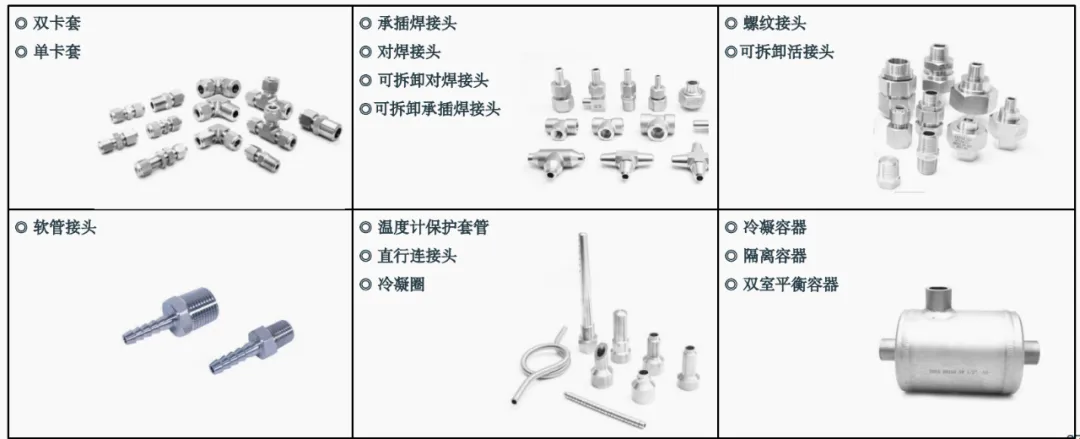 (2)目前我司制造的管件品类有:卡套接头、焊接接头、螺纹接头、软管接头、温度计保护套管、辅助容器等。