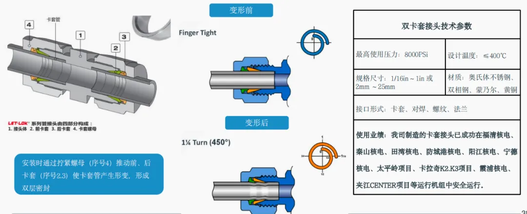 双卡套接头因密封效果好、拆卸方便、 可重复安装、维护成本低等特点,广泛运用在石化、核电、氢能源等仪控管路中。