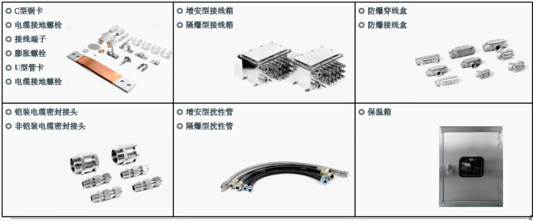 (3)目前我司制造的防爆电气品类有:接地件、接线箱、穿线盒、电缆密封接头、扰性管、保温箱等