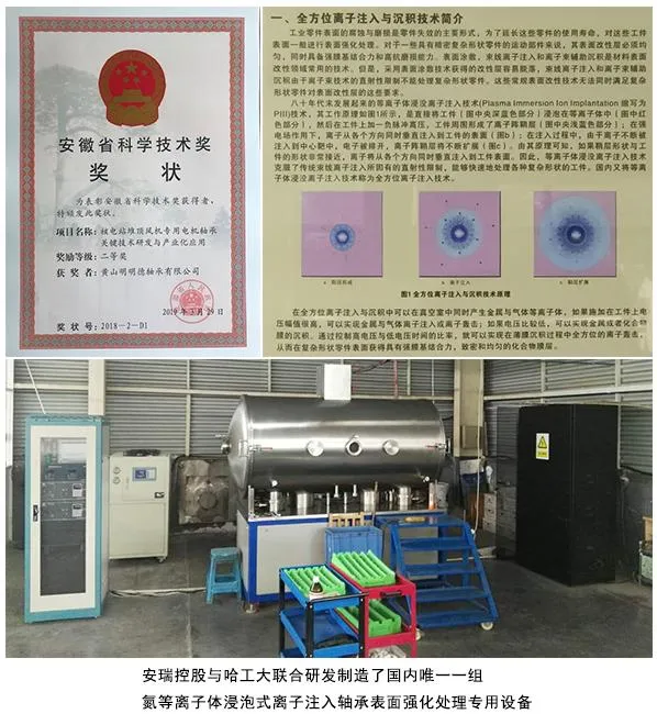 经杭州试验中心测试,经离子注表面处理的轴承寿命可达12L10以上。目前实况使用寿命1200小时以上,是进口轴承寿命的3倍左右,完成了出口替代。