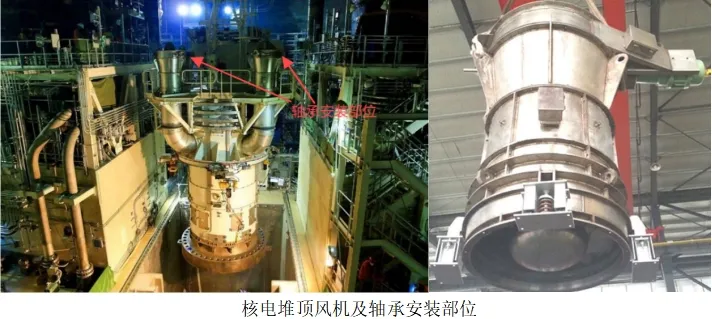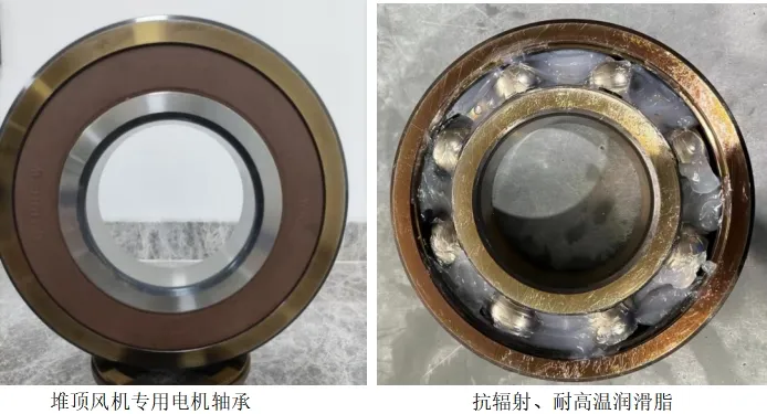 1、CAP1000、CAP1400堆顶风机电机用轴承:【产品描述】: 堆顶风机立式安装,配套电机轴伸安装风机轮毂,叶轮等部件,电机轴承需承受一定的轴向力;且能在环境温度38℃~ 82℃情况下正常运行,要求2年内不损坏,不加油脂,不维护,并能承受一定辐照剂量。考虑到核工程的核污染和更换、维修的危险性,建议一个大修内堆顶风机电机用轴承整台更换。