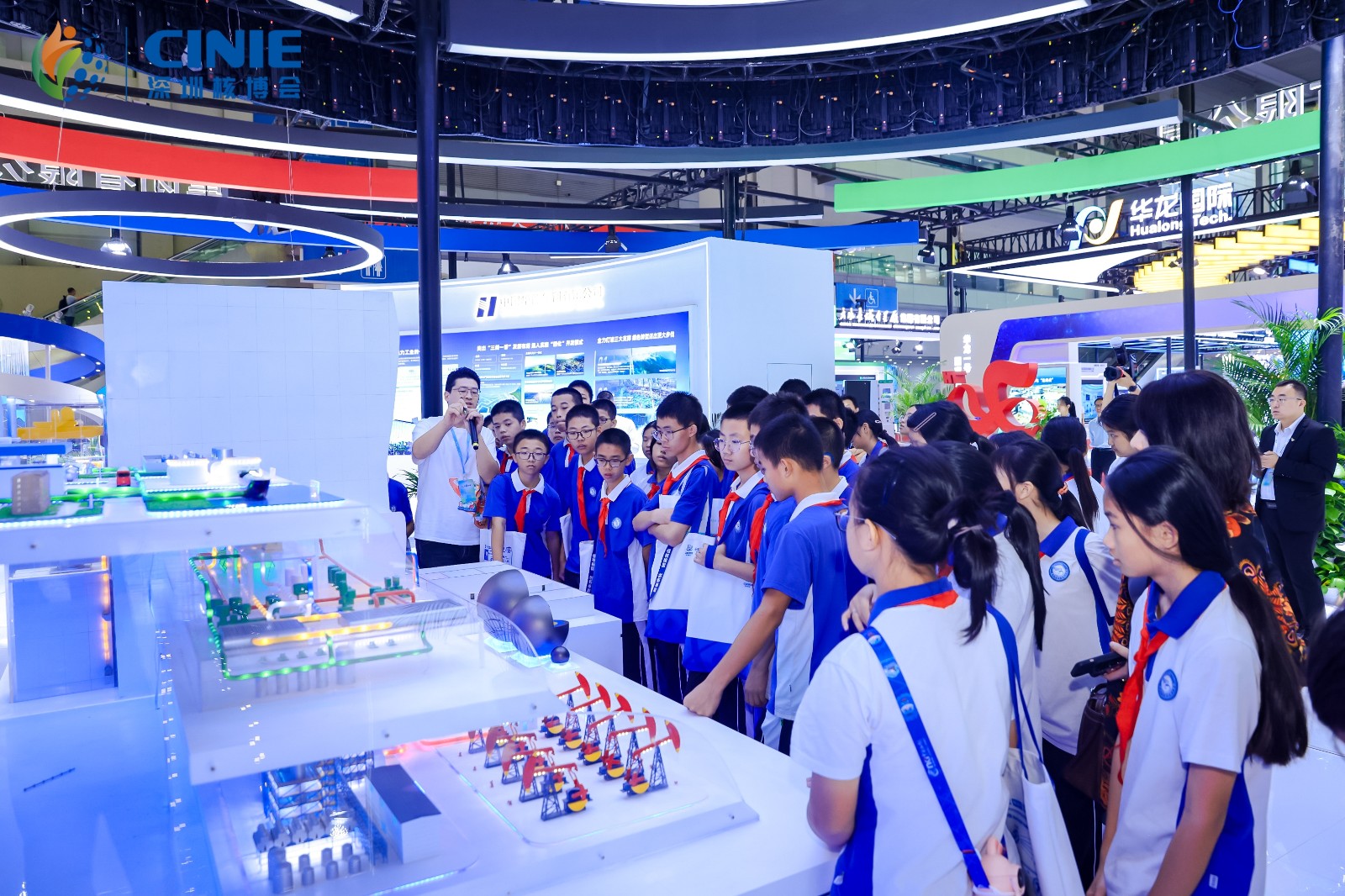 在工作人员的带领下,参与本次研学的师生们参观了中广核集团、中核集团、国家电投集团、中国华能集团等参观区域,讲解员用生动的语言和详实的资料,向学生们介绍了“华龙一号”的设计理念、安全性能以及它在全球核电领域的领先地位。