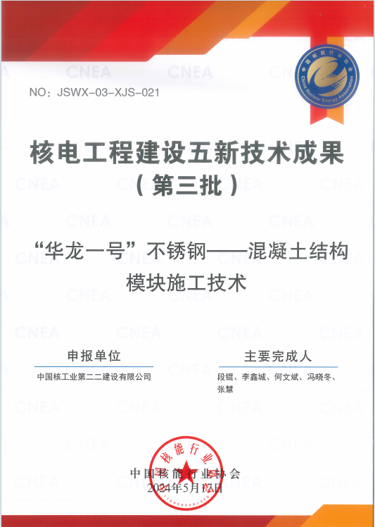 该技术是核电行业内首创,填补了国内不锈钢混凝土结构模块施工的技术空白,荣获中国核能行业协会“核电工程建设五新技术成果”,具有很高的推广价值。