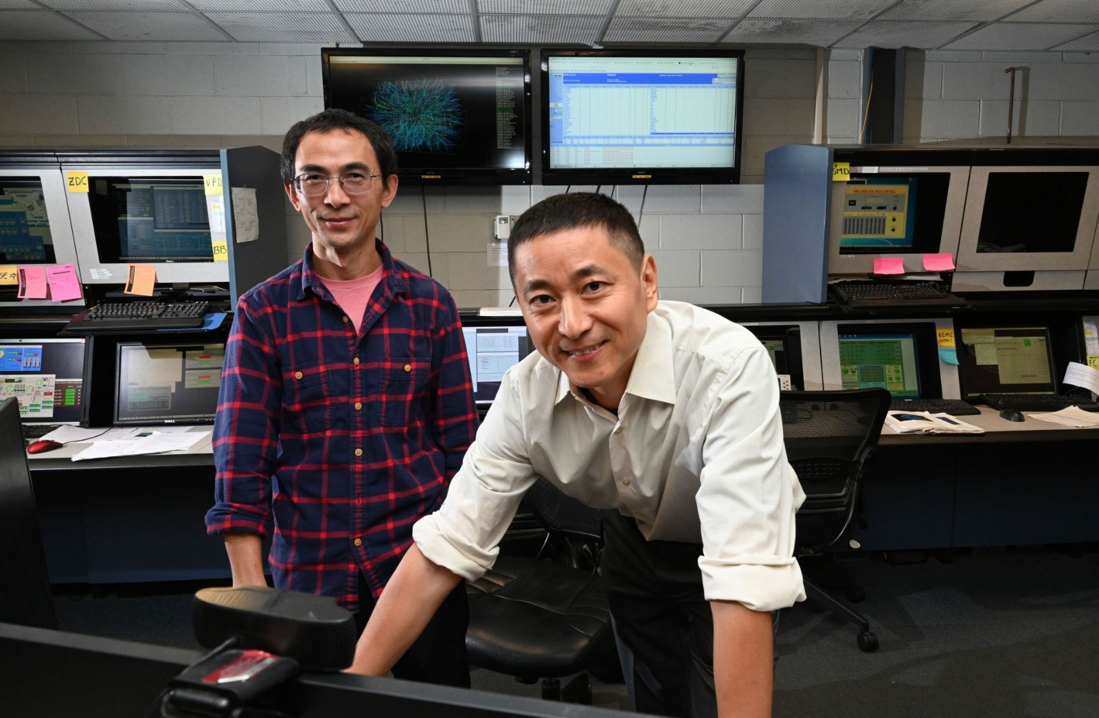 STAR 研究的共同作者、石溪大学 (Stony Brook University) 的江永嘉 (Jiangyong Jia) (前) 和黄胜利 (Shengli Huang) 在 BNL RHIC 的 STAR 实验控制室中。 (照片:Kevin Coughlin/BNL)
