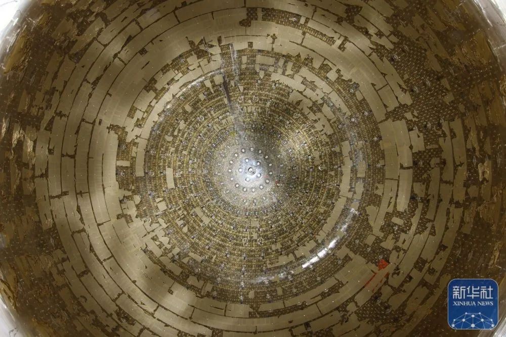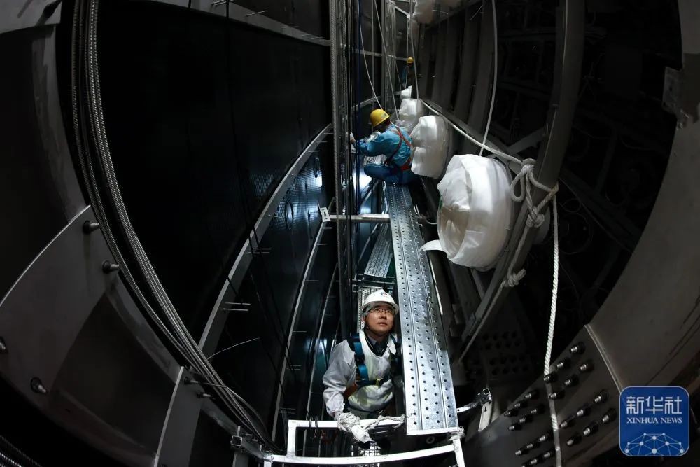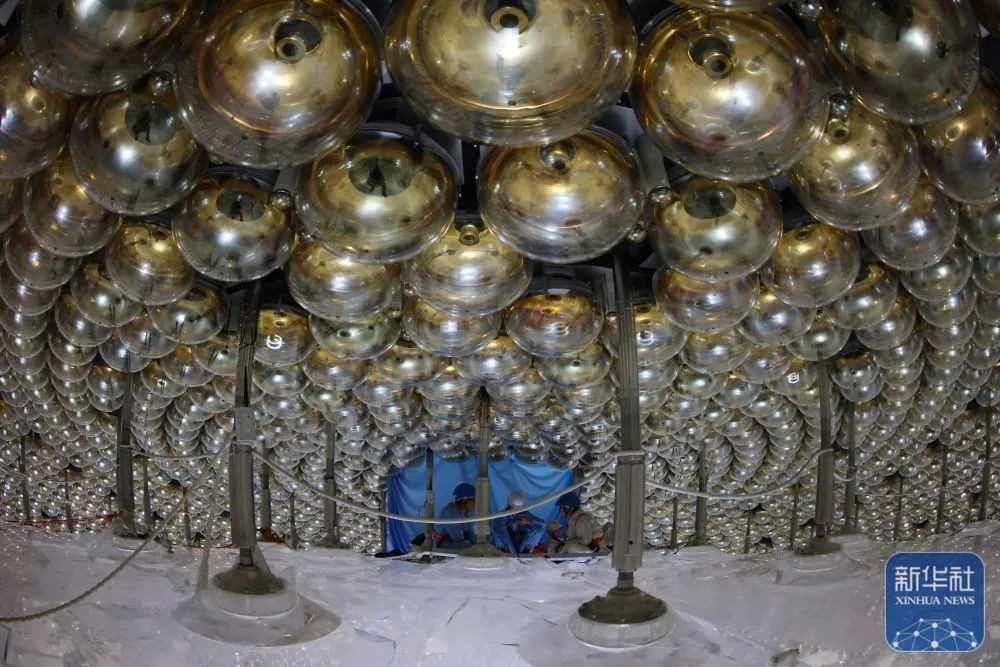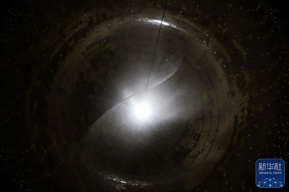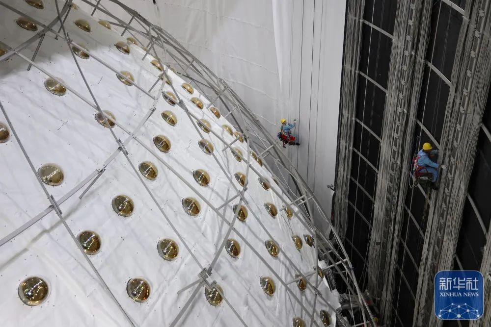 11月23日,中国科学院高能物理研究所研究员、江门中微子实验总工程师和特聘青年研究员在探测器有机玻璃球球顶观察清洗情况。