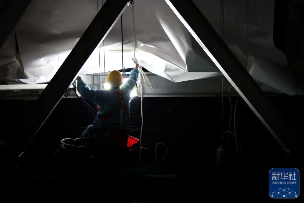 11月22日,中国科学院高能物理研究所研究员在探测器球体外表面赤道附近检查安装情况。