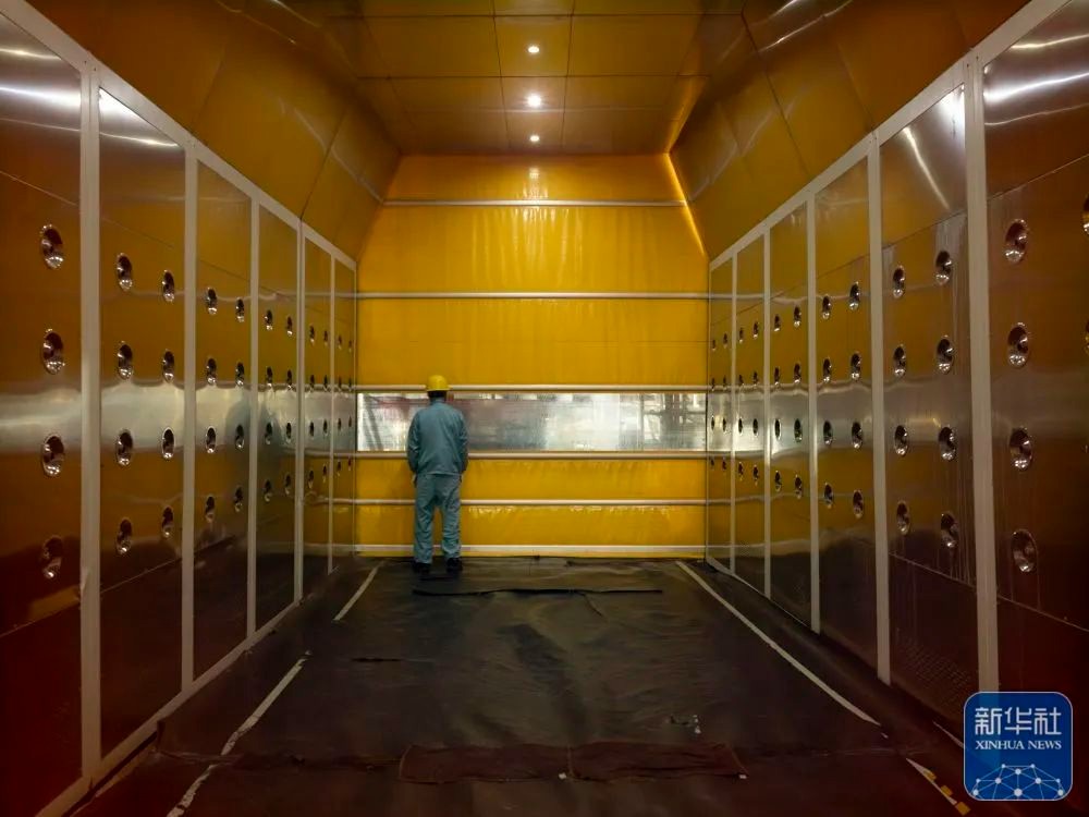 11月22日,一名工作人员在风淋系统里等待进入池底。