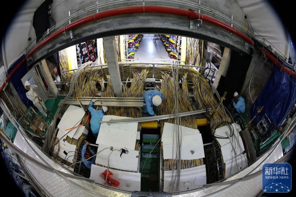 11月23日,工作人员在实验大厅布置电子学线缆。