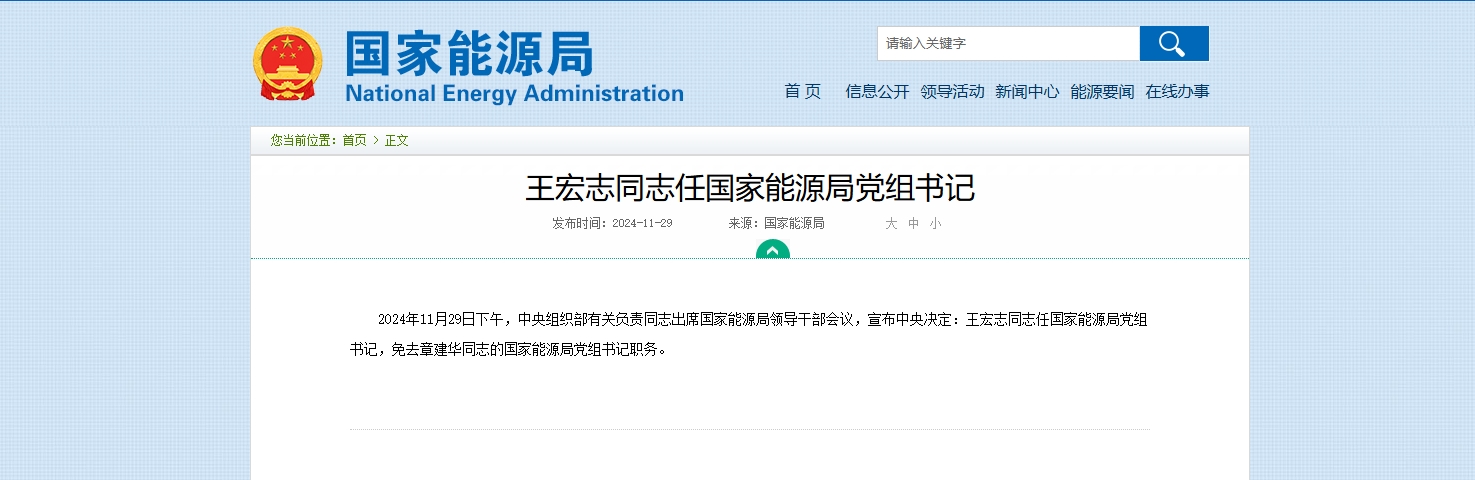 2024年11月29日下午,中央组织部有关负责同志出席国家能源局领导干部会议,宣布中央决定:王宏志同志任国家能源局党组书记,免去章建华同志的国家能源局党组书记职务。