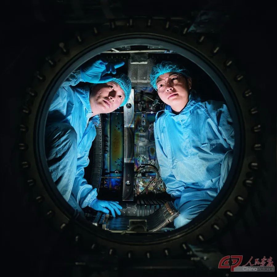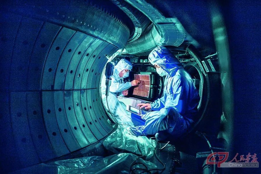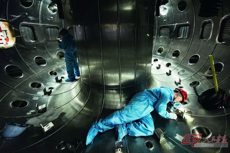 2022年4月26日,中核集团科技人员在新一代人造太阳真空室内安装关键部件。摄影 王大江