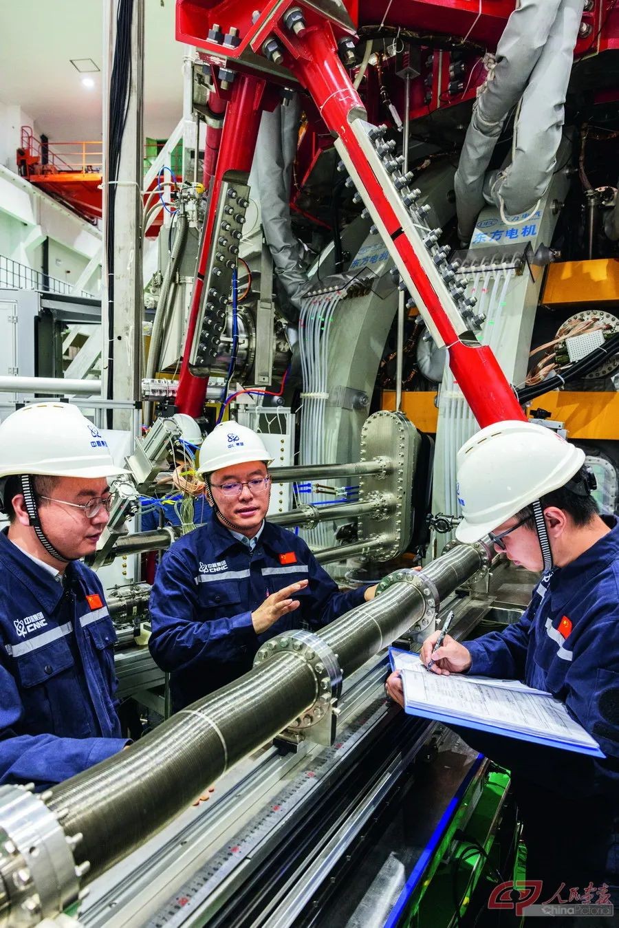 西物院聚变科学所副所长季小全(中)与西物院聚变科学所副所长张龙(左)对新一代人造太阳“中国环流三号”进行指导工作。摄影 徐讯/人民画报