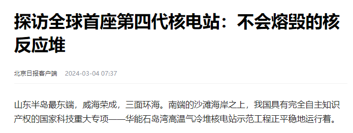 其示范项目位于山东半岛最东端,叫做华能石岛湾高温气冷堆核电站示范工程,是全球首座第四代核电站,也被称为“不会的熔毁核反应堆”。