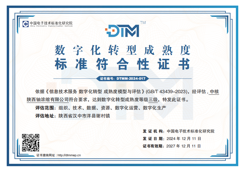 近日,中核陕铀通过由工信部组织的数字化转型成熟度贯标评估(DTMM)以及智能制造能力成熟度评估(CMMM)认证,成为全国首批、行业首家数字化转型成熟度与智能制造成熟度两套国家标准体系三级认证达标企业。