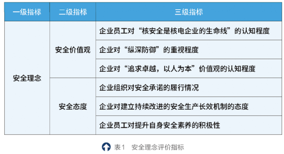 核电施工单位应从核电项目施工质量安全相关的事件、法律法规遵守、程序文件有效性等方面考虑,并结合核安全文化的总体特征,列出能够明显影响安全文化的因素,自上而下,得到施工单位、各部门乃至各施工班组的核安全文化指标。对每个指标的权重进行分析和筛选,以每年度的改进目标为准绳,定期进行计算,得出每个指标的指数。通过对指数的分析,查找出本阶段核安全文化建设中哪些方面存在不足,进行趋势分析和提出纠正行动。广东核电安全文化评价指标分为三级,根据指标的重要程度赋予不同的分数和权重,通过对三级指标的评价,统计分析得出一级指标的效果评价。表1以广东核电安全文化中安全理念评价指标为例,以供借鉴和学习。