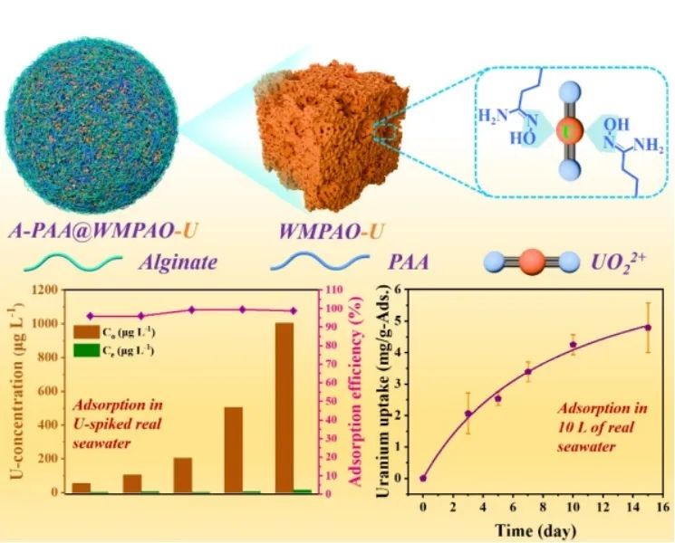 近日,中国科学院大连化学物理研究所研究员陈吉平团队在海水提铀研究方面取得进展。该团队利用精心设计的蜡铸造法和“相转换”过程,制备了具有大孔结构的聚偕胺肟(WMPAO)水凝胶粒子,并将WMPAO包覆进海藻酸-聚丙烯酸(A-PAA)球中,制备了A-PAA@WMPAO复合球材料。该复合球材料可用于海水中铀酰离子的富集分离。