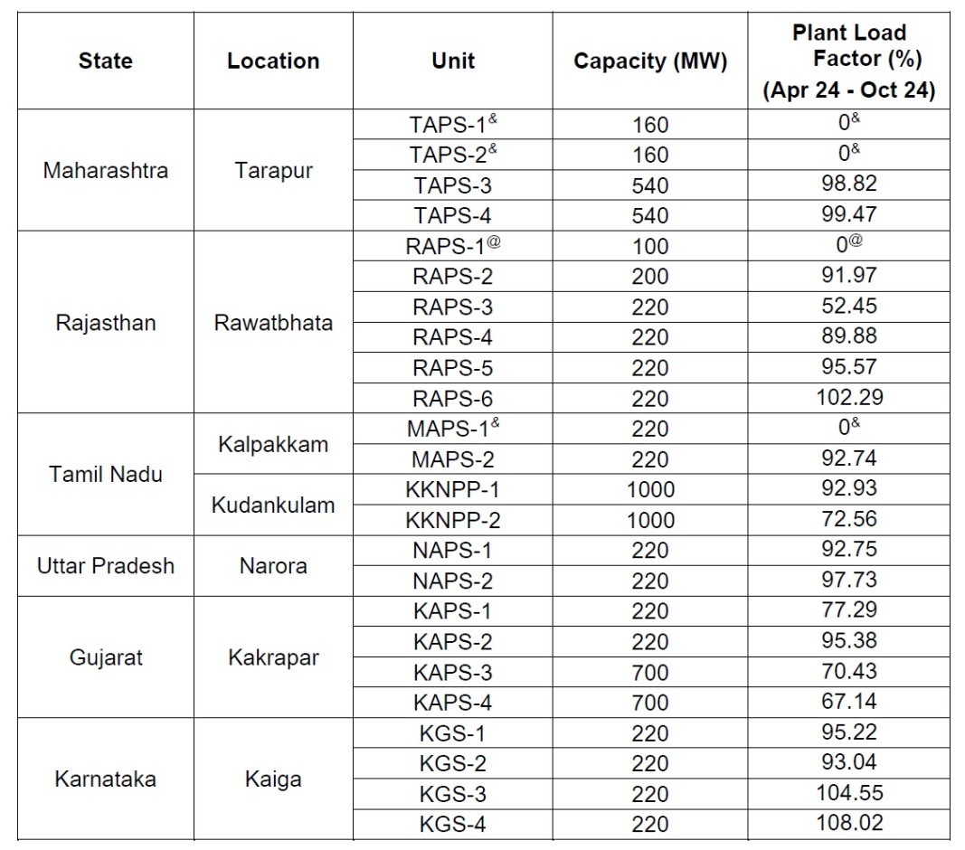 该官员总结了2024年4月至10月期间印度核电站现有发电机组的表现。