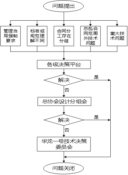 “华龙一号”示范工程设计变更多、首次设备制造带来的反复计算迭代与验证多,根据分工,合同范围内的技术决策依靠总承包商内部技术决策流程开展,重大事项通过技术决策委员会开展,综合决策以项目总经理协调会决议为准。