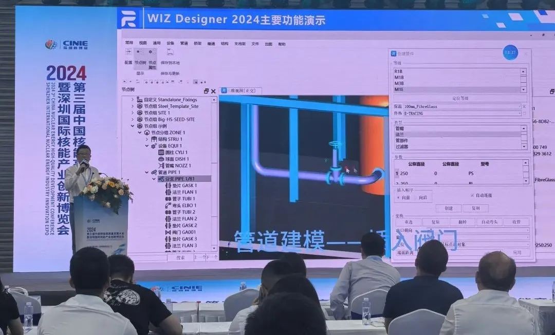 11月12日,深圳鹏锐信息技术股份有限公司参加2024第三届中国核能高质量发展大会暨深圳国际核能产业创新博览会,会上公司核电事业部技术总监-黄文强介绍了公司的最新产品,国产化工厂三维设计协同平台WIZ DESIGNER 2024。