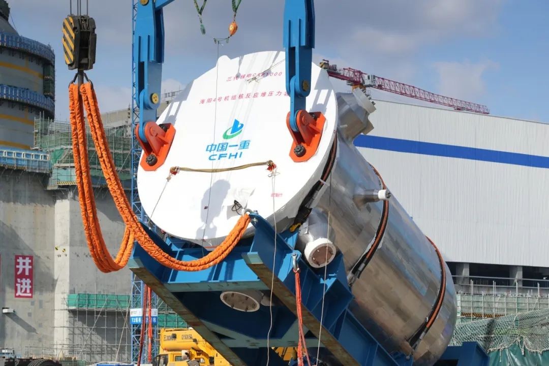▲11月18日,由中国一重承制的国家电投集团山东核电4号机组反应堆压力容器吊装就位。