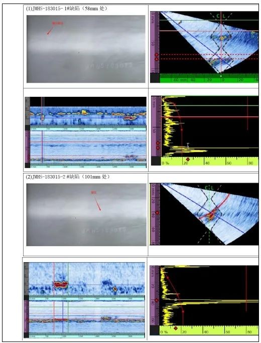相控阵检测工艺采用B 级技术等级,单面双侧扇形扫查,公称厚度小于30mm采用一次波和二次波同时设置检测;公称厚度大于30mm采用一次波和二次波分开设置检测。具体见工艺规程。缺陷定量采用定量线绝对灵敏度法按影像的实际轮廓测定缺陷指示长度,缺陷的高度采用相控阵成像技术。大厚壁试验对比采用JMHS-183015 大厚壁试块,规格:400×400×43mm,材质:20#,对比检测数据如下: