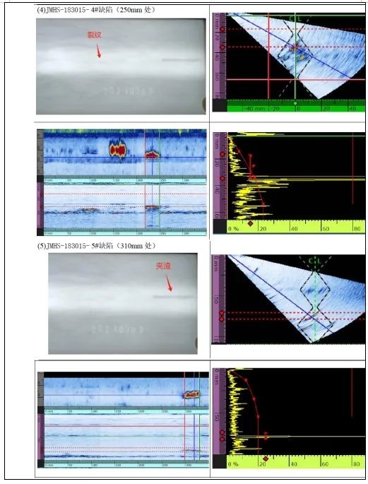 针对JMHS-183015 厚壁试块,RT、PA对比检测,RT 检出4 处缺陷, PA 检出所有设计缺陷。1 号缺陷设计为横向裂纹,RT 检出此裂纹长度为20mm,与设计长度相当;PA 能检出此裂纹,但由于焊缝存在余高,所以对此横向裂纹进行测长比较困难。2 号缺陷为裂纹,RT显示长度为39mm,比设计长度小1mm;PA 检出的长度与设计长度相当。3 号为未焊透,RT 检测显示缺陷轮廓不清晰;PA 检出的长度为33mm,比设计长度大3mm,可能是由于缺陷反射波幅较高,按定量线绝对灵敏度法测长所致。4 号为裂纹,RT 及PA 检出的长度与设计长度相同。5 号为夹渣,RT 显示长度为33mm,比设计长度大3mm;PA 检出的长度与设计长度相同。