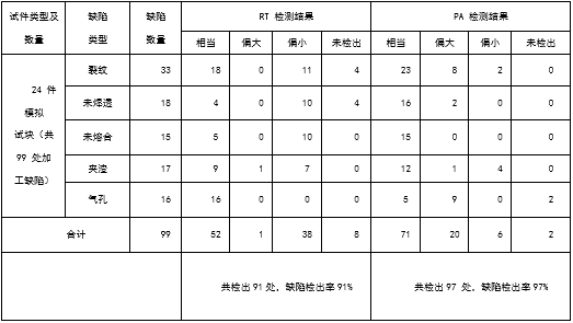 通过对24 件大、中、小径模拟试块共99 处加工缺陷进行了射线检测和相控阵超声检测比对试验,其中裂纹33 处、未焊透18处、未熔合15、夹渣17 处、气孔16处。RT 共检出91 处缺陷,缺陷检出率为91%,其中4 处裂纹、4处未焊透缺陷未能清晰地检出,主要为厚壁试件;另外91处缺陷检出结果1 处偏大外,38处偏小,其余与设计尺寸基本相当。PA共检出97处缺陷,缺陷检出率为97%,针对2 处横向裂纹,因焊缝存在余高,故对2 处横向裂纹进行测长比较困难;针对2处气孔检测困难未检出,71处缺陷检出的结果尺寸相当、20处偏大。