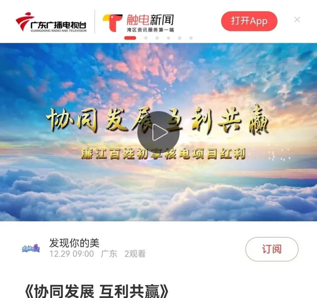 12月29日,广东台触电新闻APP、湛江TV、第一视线视频号等平台发布专题视频,《协同发展 互利共赢丨廉江百姓初享核电项目红利》,详细报道了湛江核电践行“以人民为中心”的发展理念积极承担央企社会责任主动融入广东省“百千万工程”,与地方协同发展、互利共赢的生动实践。