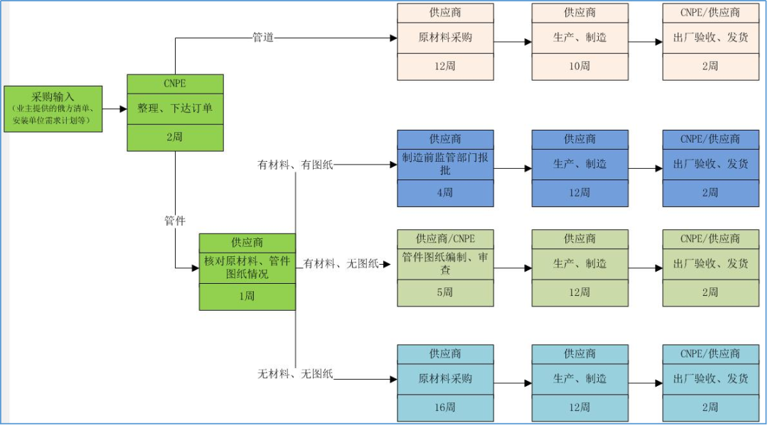 根据核岛安装合同,工艺管道大宗材料应于安装前6个月供货至预制场。中俄双方签订的供图合同,工艺管道图纸于安装前6~9个月提供,造成中方收到俄方图纸后仅有3~6个月采购周期,造成采购周期不足。为此,通过将大宗材料进行分类采购和流程优化,缩短采购周期至4.37~5.98个月,从而保证材料供货满足预制安装需求。