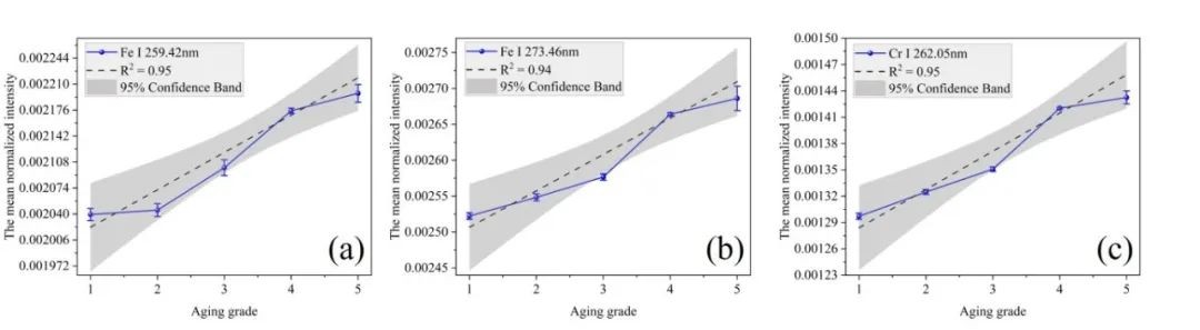 初步研究了不同老化等级样品的光谱特性响应情况。选择Fe Ⅰ 259.42 nm、Fe Ⅰ 273.46 nm和Cr Ⅰ 262.05 nm作为分析谱线。这是因为这些谱线激发稳定且不受其他元素谱线干扰。结果表明,三条谱线归一化后的峰值强度与老化等级之间呈正相关,R2分别为0.95、0.94和0.95(图2)。