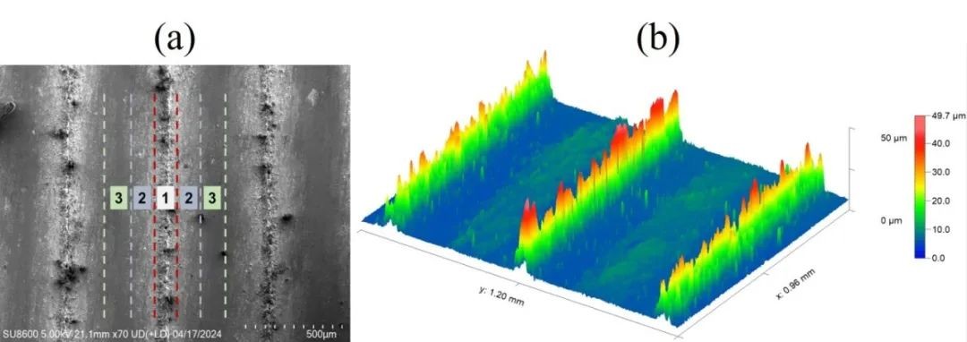 图4 激光烧蚀后样品的表面形貌:(a)激光烧蚀产生的凹坑的扫描电镜图像:(1)激光烧蚀的核心区域,(2)激光烧蚀的热影响区域,(3)样品表面;(b)激光烧蚀后的三维形貌分析