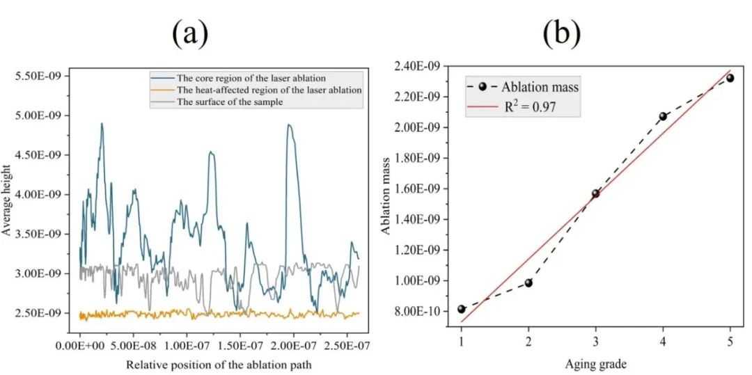 图5 烧蚀质量评估:(a)烧蚀路径的平均高度;(b)烧蚀质量与老化等级的相关性