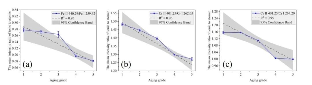图6 离子线与原子线峰值强度比与老化等级之间的相关性,误差棒表示5次重复测量的标准偏差:(a)Fe II/Fe I,(b)和(c)Cr II/Cr I