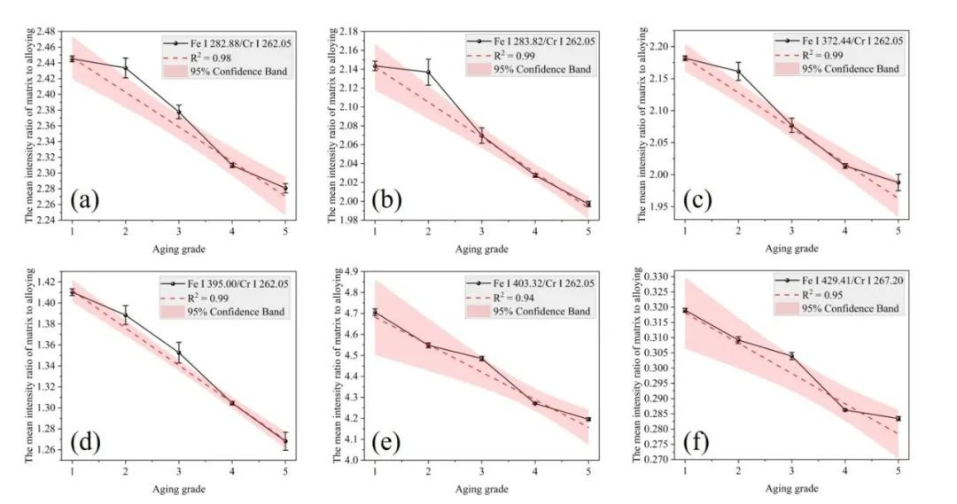 离子线与原子线的谱线强度比已被证明是表征基体效应的有效手段。本文提出利用基体元素Fe和合金元素Cr的离子线与原子线的峰值强度比建立与老化等级之间的关联性。发现Fe II 440.29/Fe I 259.42、Cr II 401.25/Cr I 262.05和Cr II 401.25/Cr I 267.20与老化等级之间呈负相关,R2分别为0.95、0.96和0.95(图6)。这些趋势说明不同老化等级样品的等离子体特性具有相似性,有助于预测样品的老化等级。