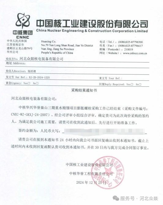 近日,河北众燚核电装备有限公司生产的核电用抗震自扩底锚栓接连中标中核华兴华誉秦山三期重水精馏项目和CX项目一期工程,这是众燚核电产品在田湾核电基地7、8号机组工程项目应用后连续中标重大核电工程,迈出核电用机械锚栓国产化坚定的步伐。