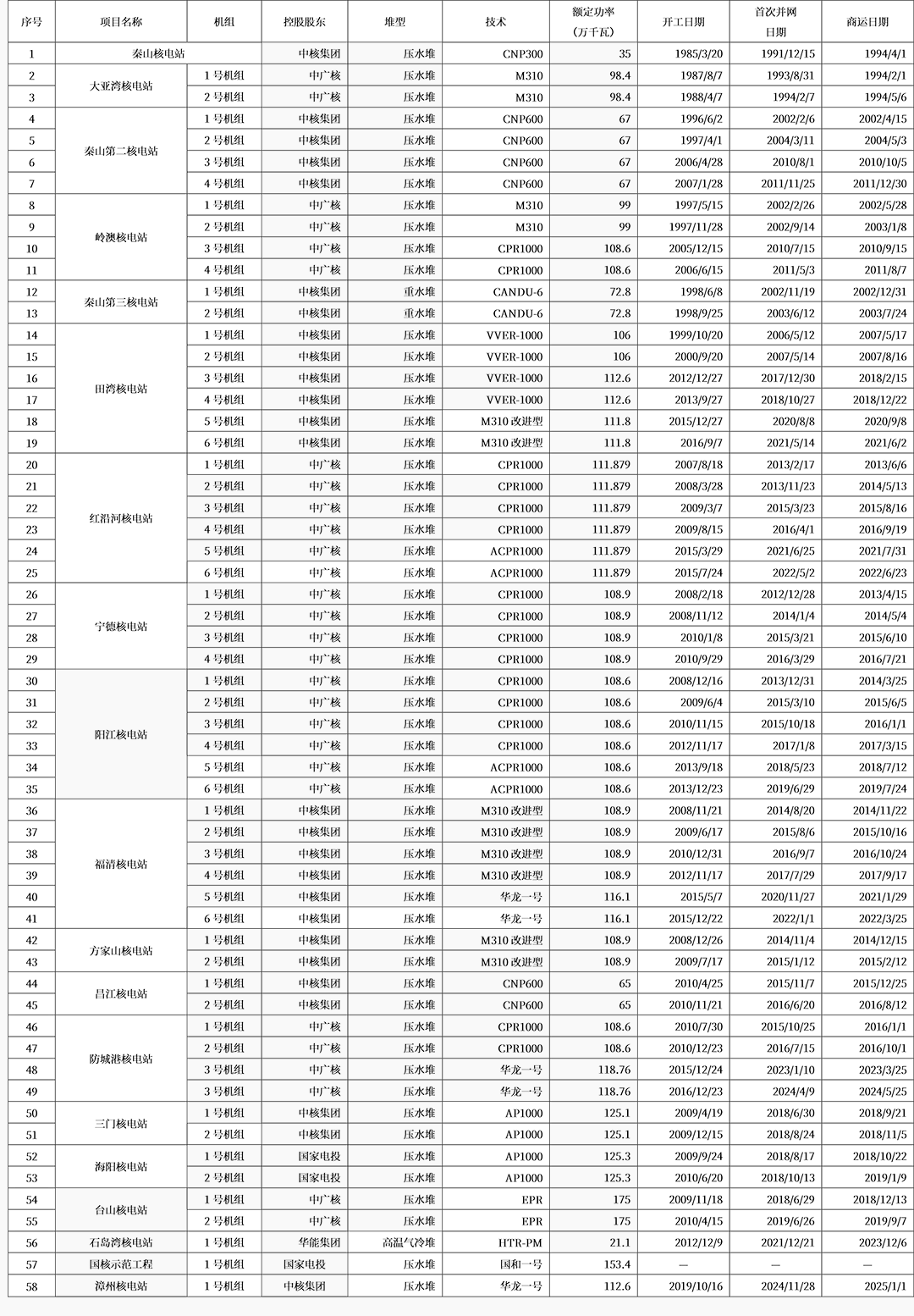 表1:我国大陆在运核电机组情况(截至2024年12月31日)