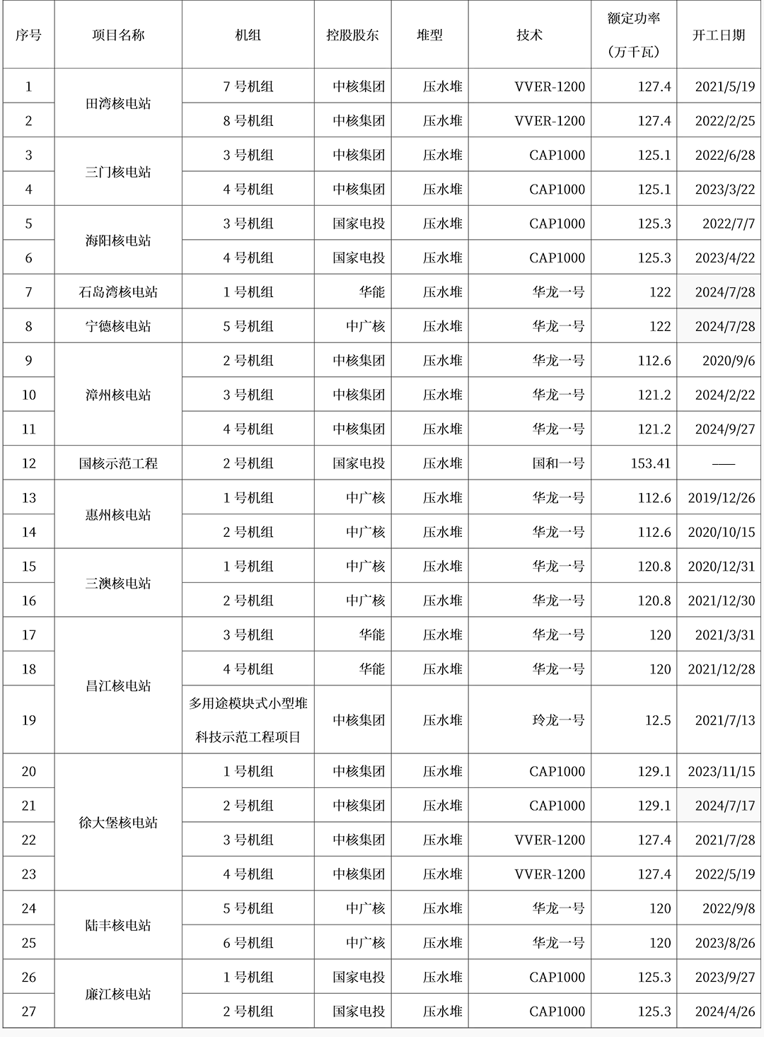 表2:我国大陆在建核电机组情况(截至2024年12月31日)