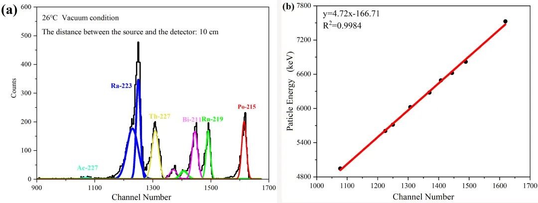 图-2 4H-SiC SBD 器件的227Ac能谱(a)及线性响应(b)