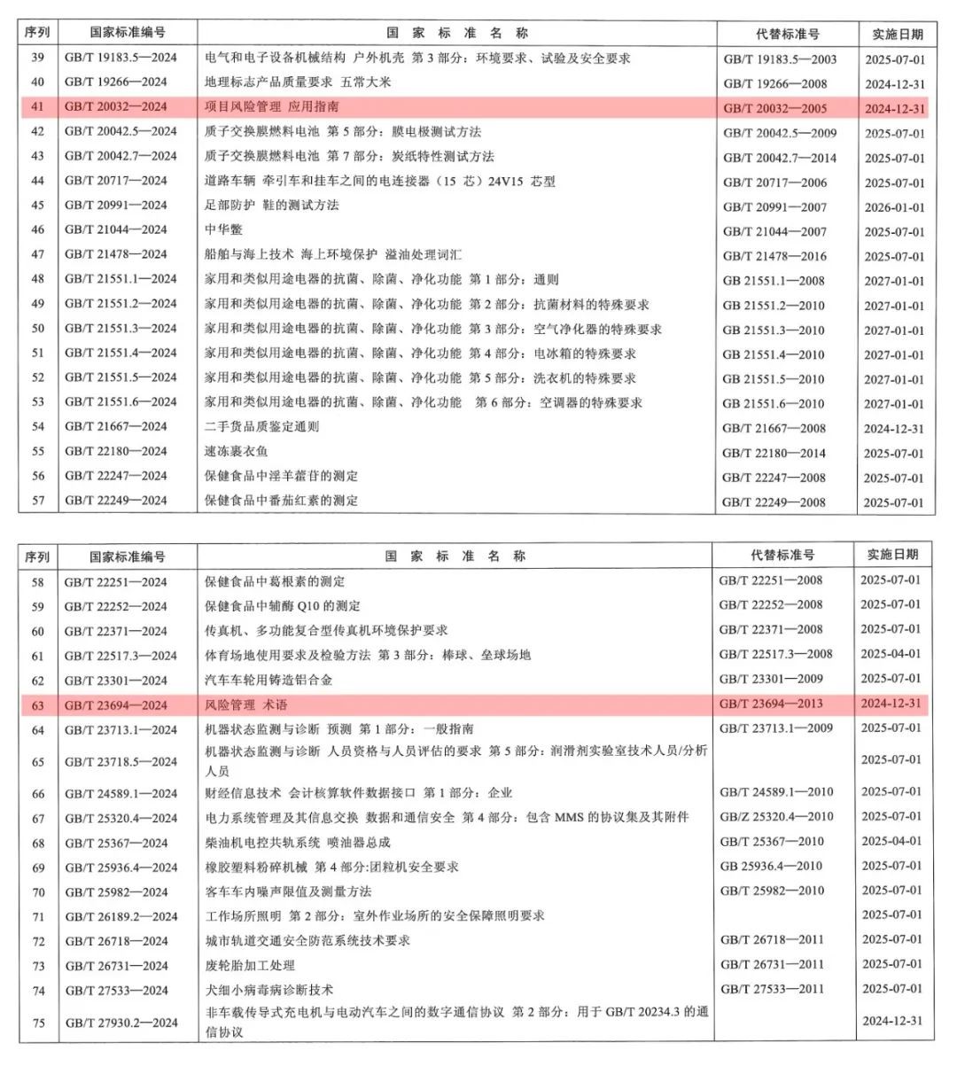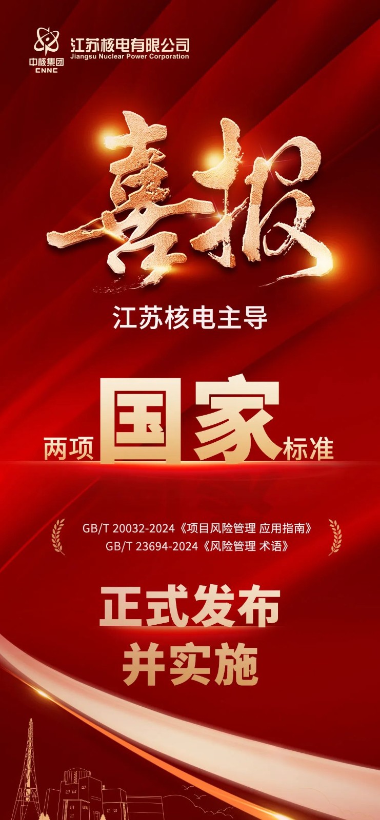 根据中华人民共和国国家标准公告2024年第32号,江苏核电牵头编制的两项国家标准GB/T 20032-2024《项目风险管理 应用指南》、GB/T 23694-2024《风险管理 术语》正式发布并实施,实现了江苏核电主导国家标准发布“零”的突破。