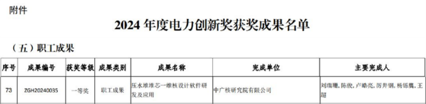近日,收到中国电力企业联合会发文通知,中广核研究院申报的“压水堆堆芯一维核设计软件研发及应用”荣获中国电力企业联合会2024年度电力创新奖一等奖。 “电力创新奖”是中国电力企业联合会设立的全国性电力创新奖项,旨在鼓励和表彰在电力行业科技创新方面作出突出贡献的单位和个人。