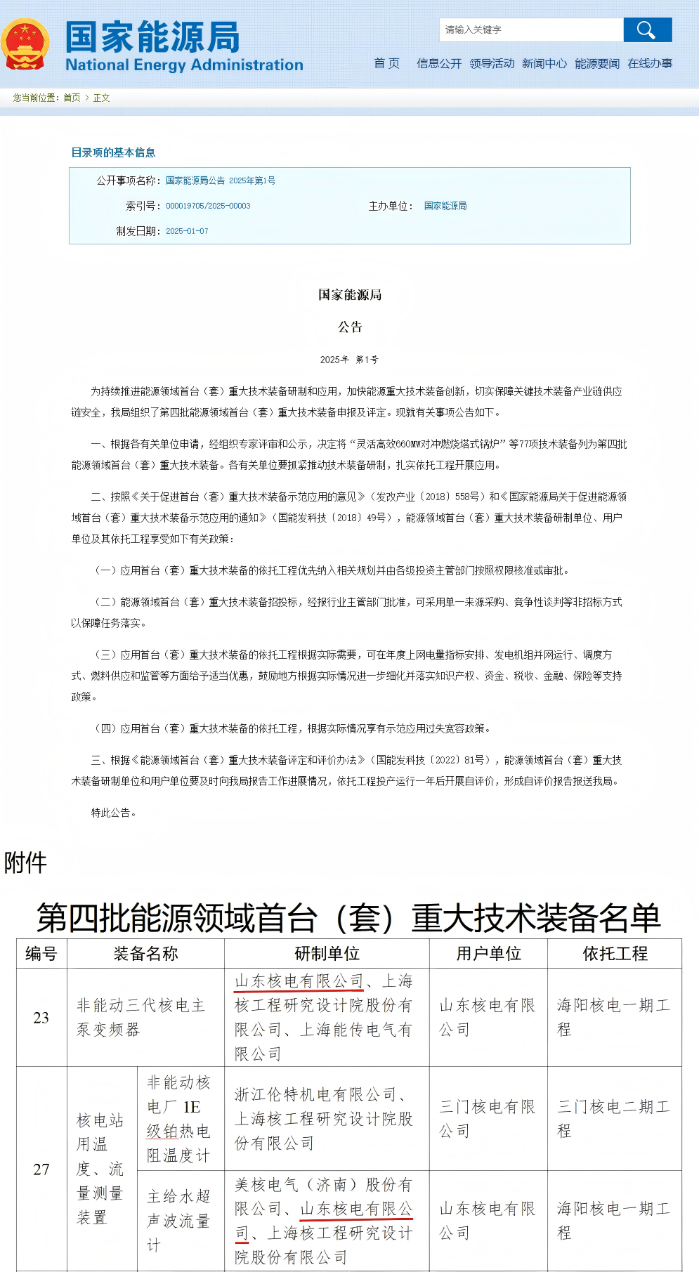 近日,山东核电“非能动三代核电主泵变频器”“主给水超声波流量计”2项重要科技成果正式列入国家能源局《第四批能源领域首台(套)重大技术装备名单》。山东核电首次作为研发单位入选该名单,充分展现在高端装备研究创新方面的实力,对于推动核电技术发展和产业升级具有重要意义。