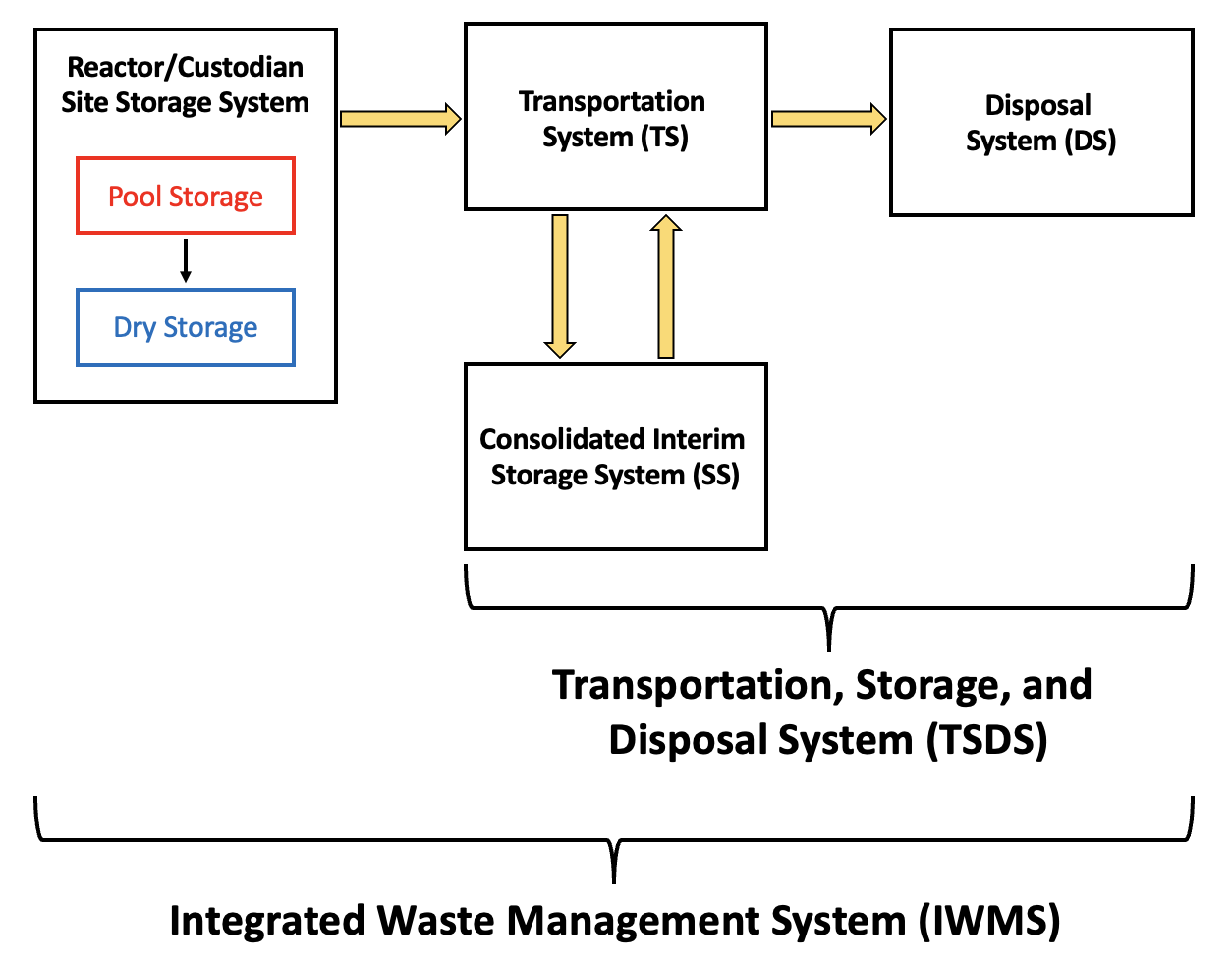 运输、储存和处置——及其相互依赖关系统称为综合废物管理系统 (IWMS)。每个都有自己的流程和步骤,共同努力实现管理 SNF 的共同目标。IWMS 可以看作是一个系统集合;它包括反应堆场地储存系统(湿式和干式储存)(就建模而言)、运输系统(铁路、驳船和重型卡车)、联邦综合临时储存设施 (CISF) 和处置系统(见图 1)。