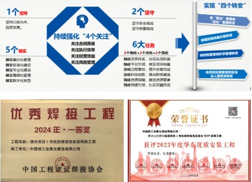 2024年,中核五公司紧密围绕“十四五”规划、“整体·协同”年专项工作部署以及股份公司重点工作安排,积极探索创新,优化并提出“1256”核电多项目管理思路,聚焦“1个坚持、2个坚守、5个做实、6大任务”,系统性推进多项目管理能力稳步提升。公司重点围绕“6大任务”系统性制定保障措施,正式发布《核与系统工程事业部多项目管理实施导则》,形成多项目管理权责清单和多项目管理体系文件清单,为项目管理提供标准化、规范化操作指南,助力多项目管理能力大幅提升。此外,公司发布“六大控制七个零”高质量精细化管理年度工作计划,持续深入推进标杆模式的推广应用,确保相关工作的长效化落实。在这一过程中,漳州核电项目1号机组常规岛安装焊接工程凭借精湛的工艺和卓越的质量,荣获优秀焊接工程一等奖;霞浦项目也凭借出色表现,斩获华东优质安装工程奖,彰显了公司在工程质量把控上的卓越实力。