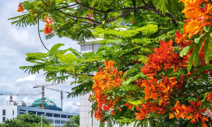 海南昌江核电基地厂区道路两旁,如霞似火的凤凰花在风中摇曳。摄影:郭莎莎/人民画报