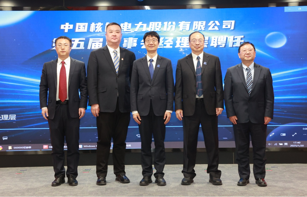 新年伊始,万象更新。1月20日,中国核电在北京召开2025年第一次临时股东大会,选举卢铁忠、邹正宇、录大恩、秦玉秀、张国华、武汉璟、虞国平、毛延翩为公司第五届董事会董事,并与职工大会选举的职工董事詹应武组成第五届董事会;选举栾韬、柳耀权、孔玉春为公司第五届监事会监事,并与职工大会选举的职工监事林睿璇、罗杨组成第五届监事会。第五届董事会第一次会议和第五届监事会第一次会议随后召开,卢铁忠当选公司董事长,栾韬当选监事会主席,董事会聘任邹正宇为总经理、张国华为总法律顾问、刘焕冰为总会计师、陈富彬为副总经理、张红军为董事会秘书。