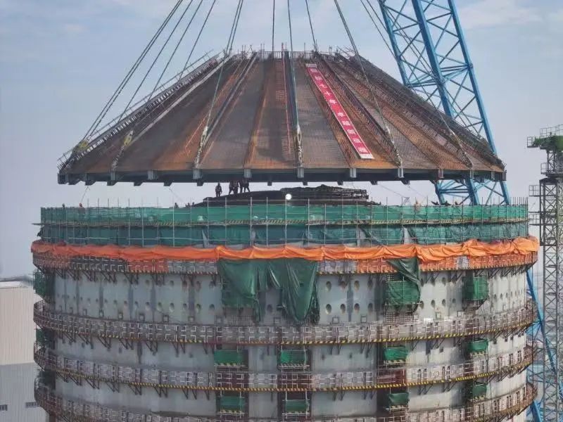 钢穹顶由上口环梁、径向梁、屋面板等构件组成,整体呈圆锥台形,直径约40米,高度约10米,位于屏蔽厂房顶部,吊装总重超过1000吨。
